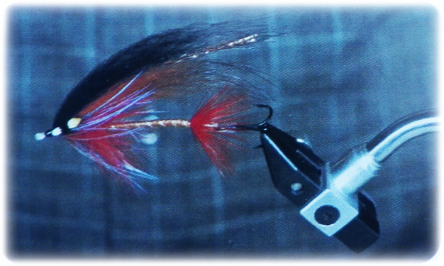 De keelhackle bestaat uit 3 slagen van een blauwe spey hackle (Jan gebruikt vulturine guinea fowl maar je kunt ook andere spey hackles gebruiken zoals fish fur of oorfazant).