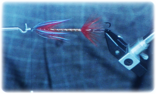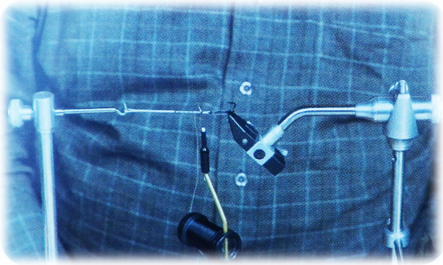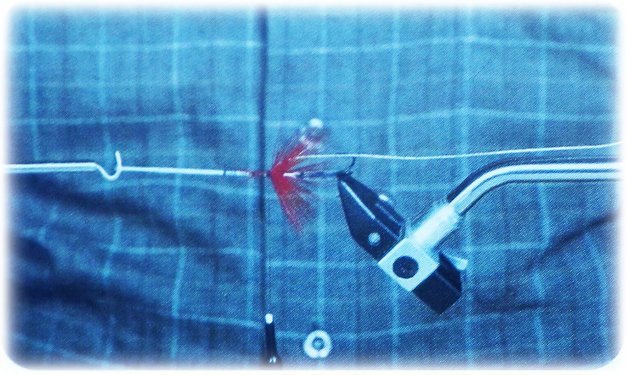 Schuif een stukje siliconenslang over de steel van de haak. Als de vlieg af is schuif je dit over het oog van de haak. Zet de haak in de bek van de vise en haak de lus in het haakje aan de andere kant en breng het braided nylon op spanning.