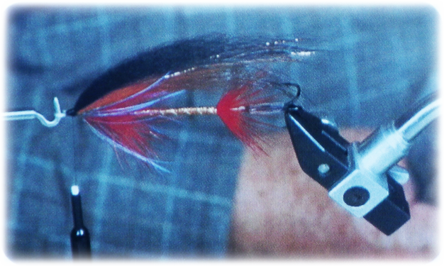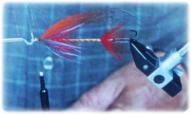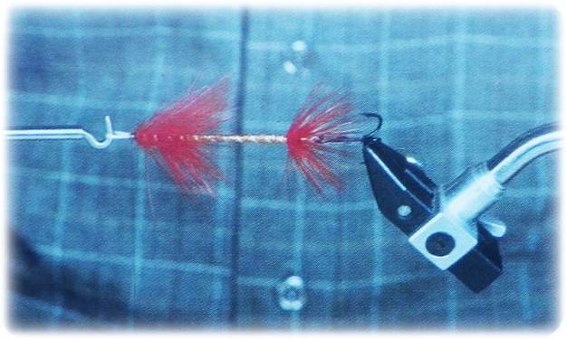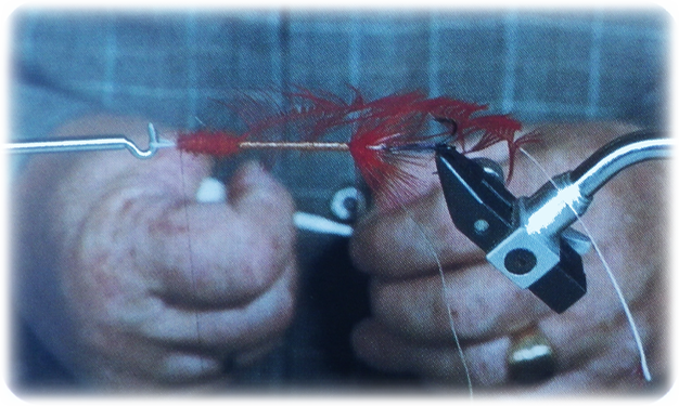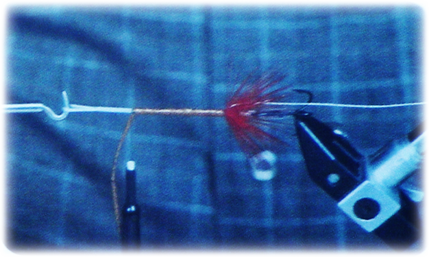 Een rode hackle bij de punt inbinden en de fibers naar één kant strijken (dubbelen). Breng de binddraad iets naar voren en wikkel de hackle met 3 of 4 dicht tegen elkaar aanliggende wikkelingen naar voren en bind de hackle af.